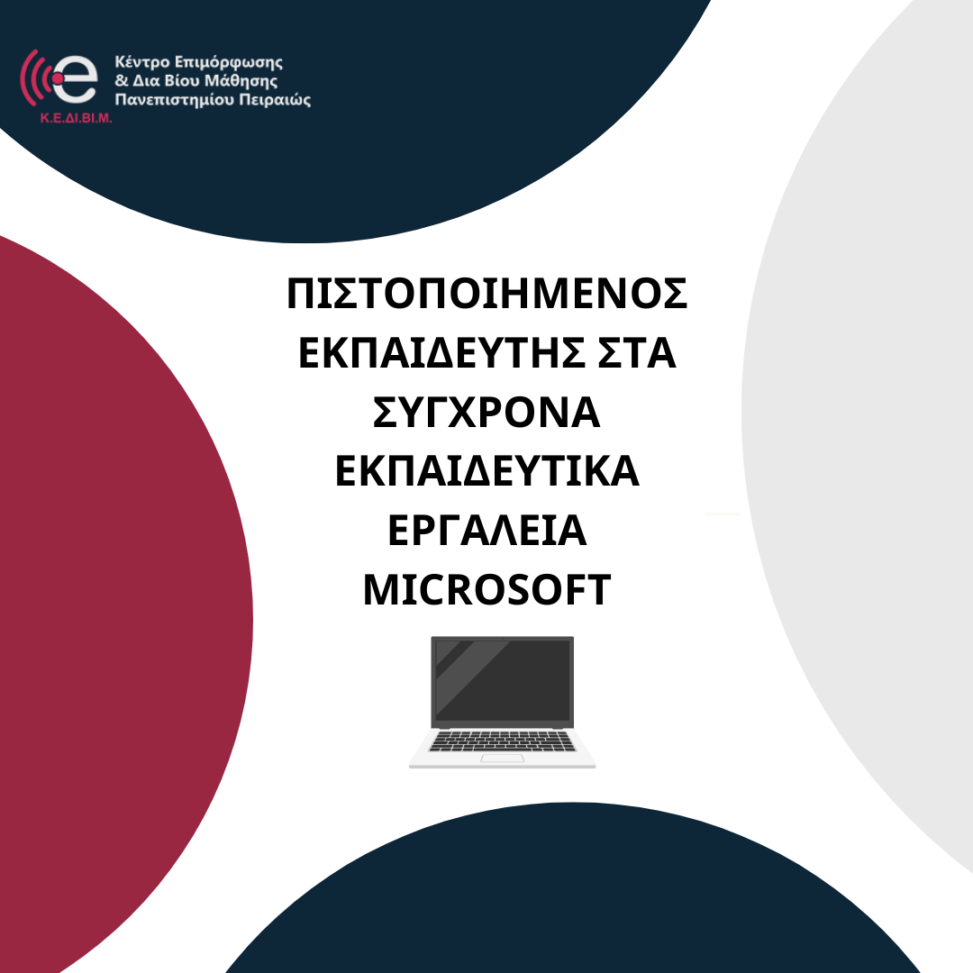 Το Κέντρο Επιμόρφωσης και Διά Βίου Μάθησης του Πανεπιστημίου Πειραιώς ανακοινώνει την έναρξη του νέου επιμορφωτικού Προγράμματος με τίτλο “Πιστοποιημένος Εκπαιδευτικός Microsoft (MCE)”, που θα ξεκινήσει σύντομα.